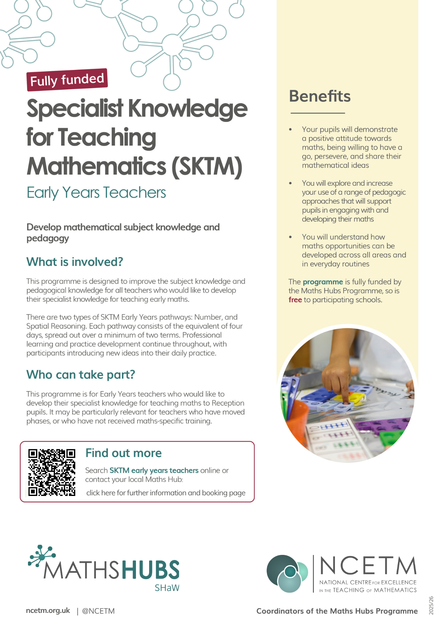 This programme supports Early Years teachers to develop specialist knowledge for teaching maths, complementing best practices in Early Years and developmental learning trajectories.